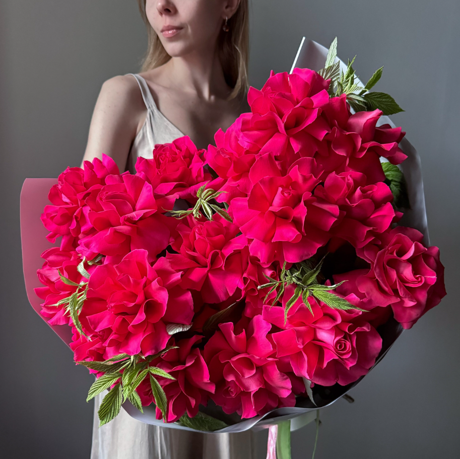 Hot pink roses arranged in a bold mono-style bouquet create a dramatic, fashion-forward statement. The oversized, ruffled blooms bring texture and movement, making the arrangement feel vibrant and full of life. Wrapped in sleek neutral paper to let the color shine, this bouquet is perfect for birthdays, celebrations, romantic gestures, or anyone who loves unapologetically bright florals.