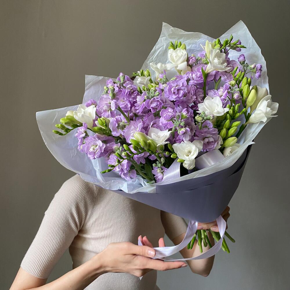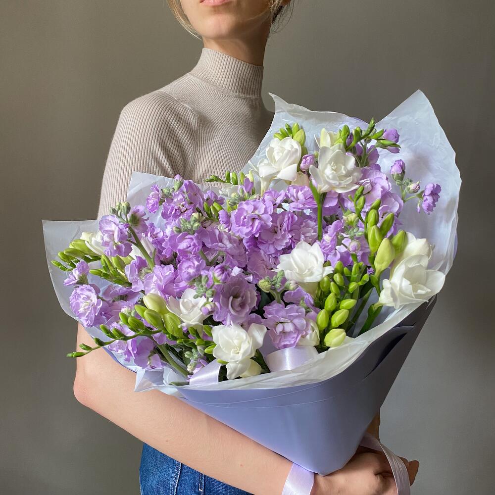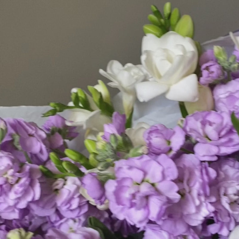 A soft, aromatic composition featuring 9 elegant white freesias paired with 5 lush stems of stock, wrapped in refined designer paper. With an approximate size of 14 inches wide and 16 inches tall, the bouquet presents a balanced, airy silhouette in gentle lavender-white tones.