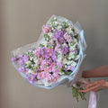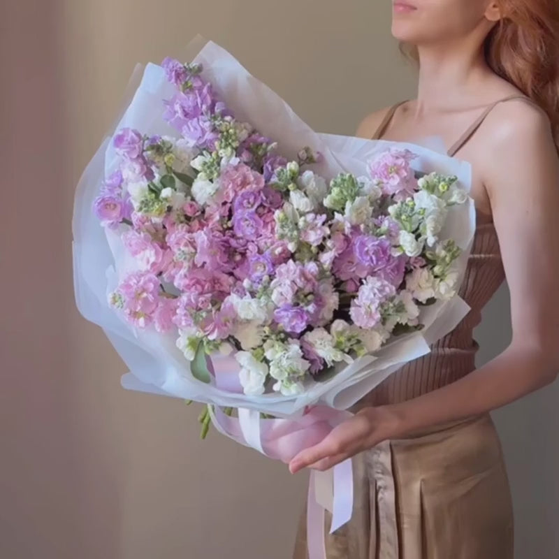 A soft, romantic arrangement featuring 15 fragrant stock stems in pink, lilac, and white — a pastel palette where every shade unfolds like a distinct note in a gentle symphony. The full, cloud-like blooms with their fine, silky petals create a lush, velvety texture throughout the bouquet.