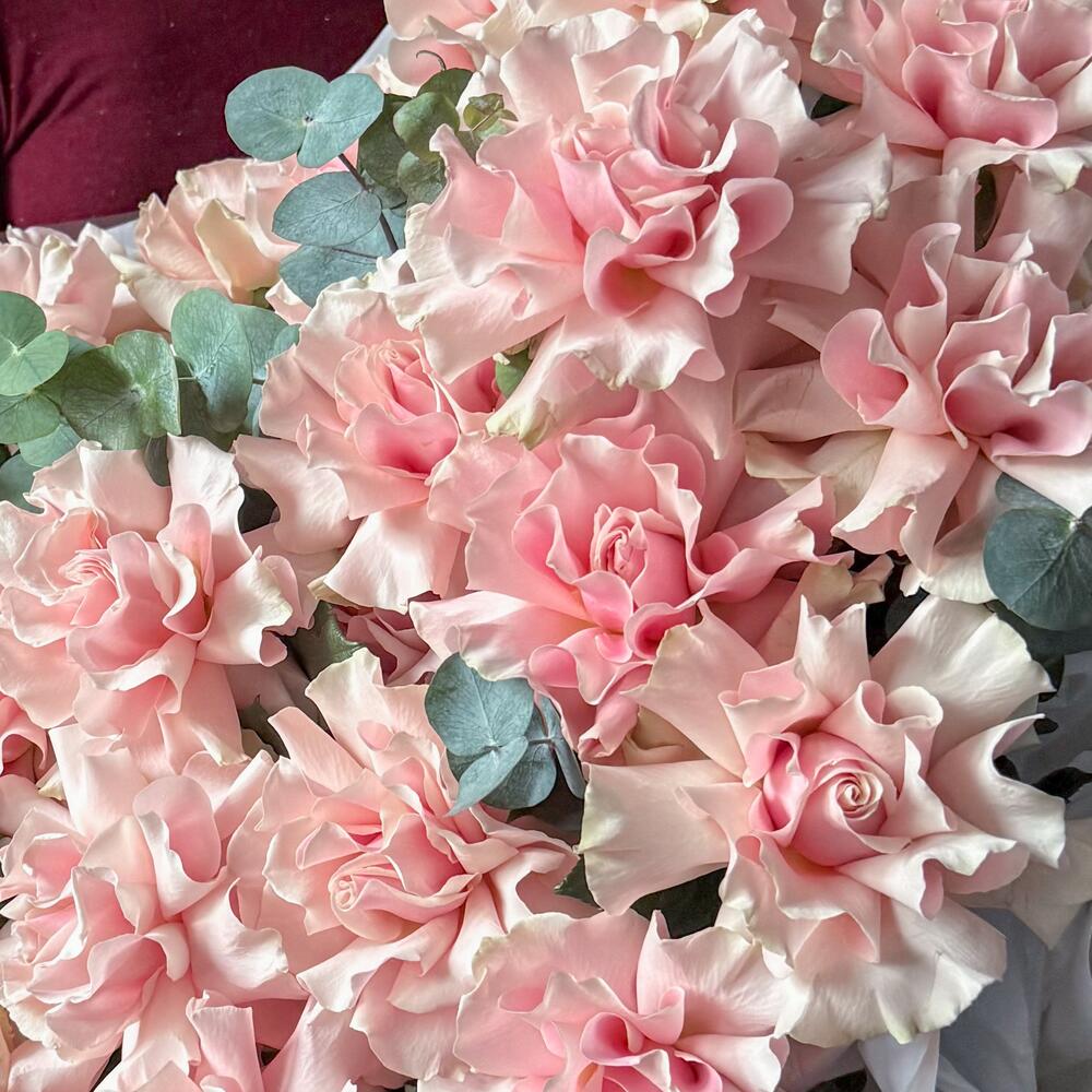 Сouture-level bouquet crafted in an elegant pink palette. The arrangement features 25 premium French Pink Mondial roses, complemented by 6 stems of pistachio greenery and 5 stems of fresh eucalyptus for nuanced texture and depth. The composition is finished with designer wrapping and two satin ribbons, enhancing its luxurious, modern presentation.