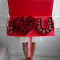 Luxury red presentation box featuring a heart of fresh red roses and premium strawberries dipped in Belgian chocolate. Some berries are coated in smooth milk chocolate, others finished with a red crunchy topping for texture and contrast. Bold, romantic, and beautifully arranged for a striking reveal.