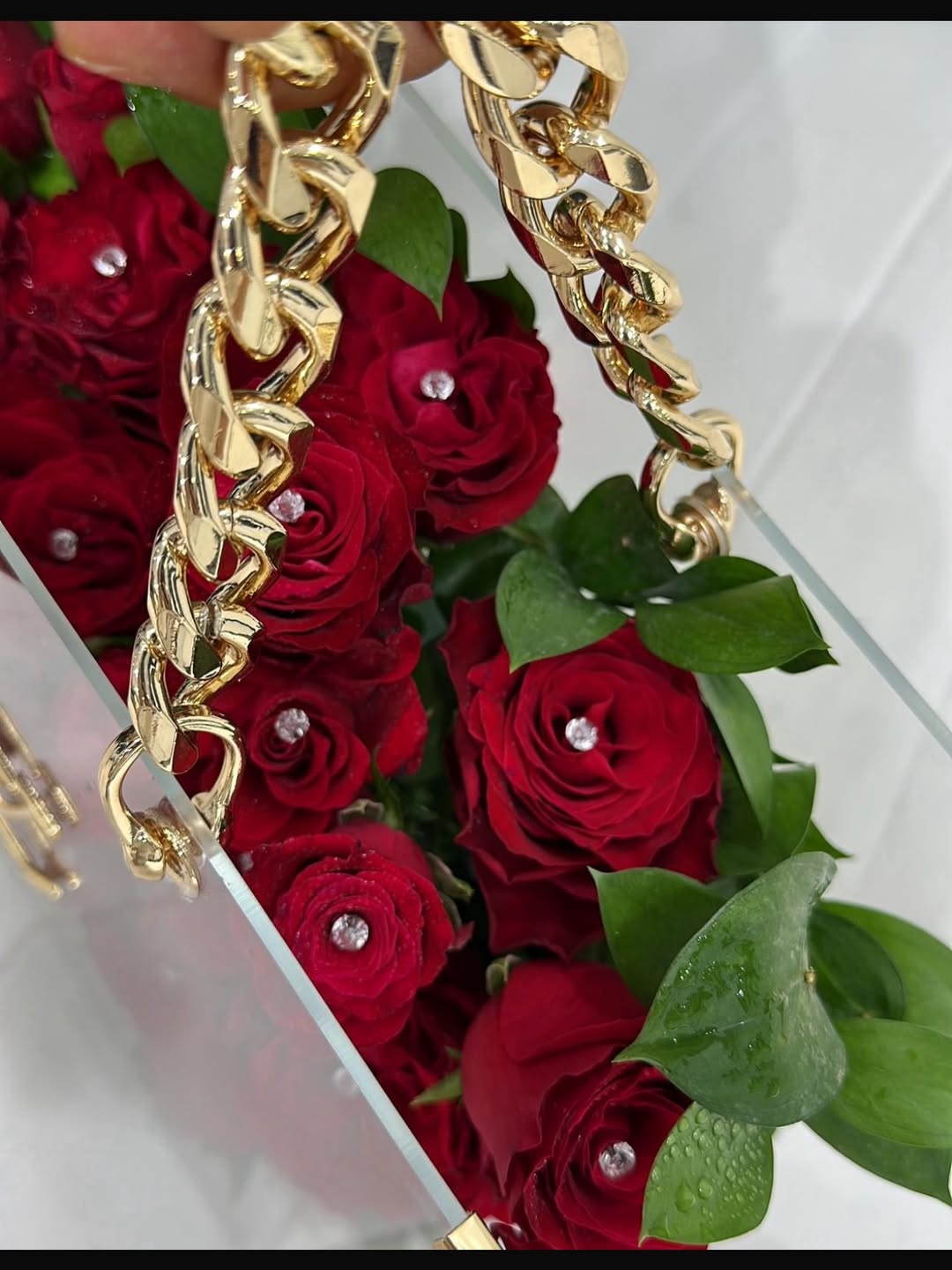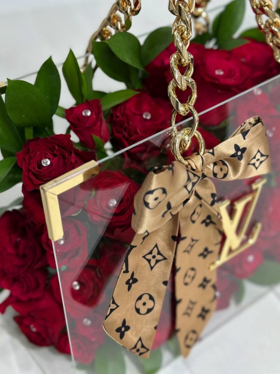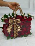 Deep red roses arranged inside a Louis Vuitton–inspired clear acrylic handbag create a bold, luxury fashion statement. Gold chain hardware and signature LV detailing give this piece a high-end designer aesthetic. Perfect for Valentine’s Day, anniversaries, proposals, or gifting someone who loves iconic fashion and dramatic florals.