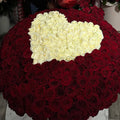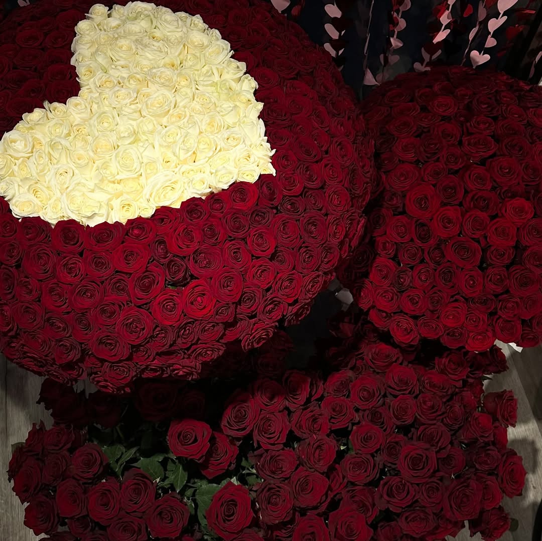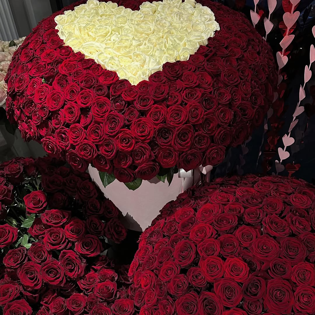 Luxury round box filled with deep red roses and a contrasting white heart made entirely of premium white roses. Dense, perfectly aligned blooms create a bold, sculpted shape with dramatic contrast. Clean, rich, and unmistakably grand in scale.