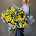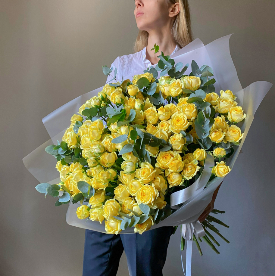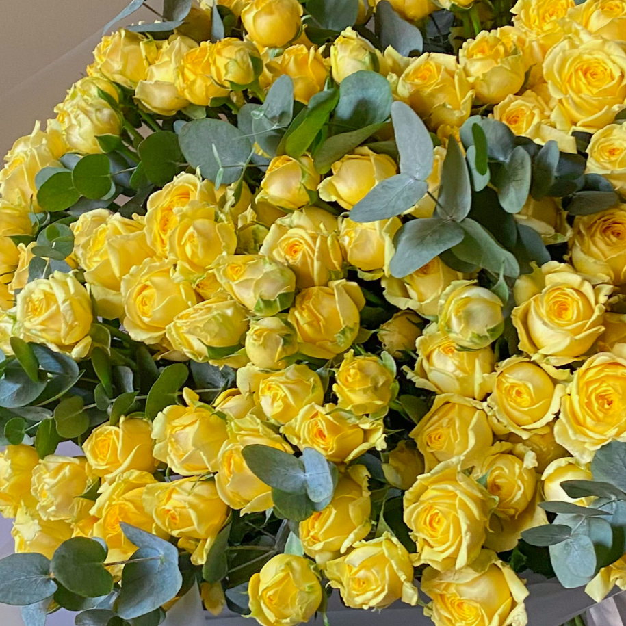 Bright yellow spray roses bring vibrant energy and a fresh, uplifting feel to this garden-style arrangement. The clustered mini rose heads create volume and softness, while eucalyptus adds natural texture and a cool-toned contrast. Wrapped in clean translucent paper with a satin ribbon finish, this bouquet feels joyful, modern, and effortlessly elegant—perfect for birthdays, celebrations, congratulations, or sending a little sunshine.