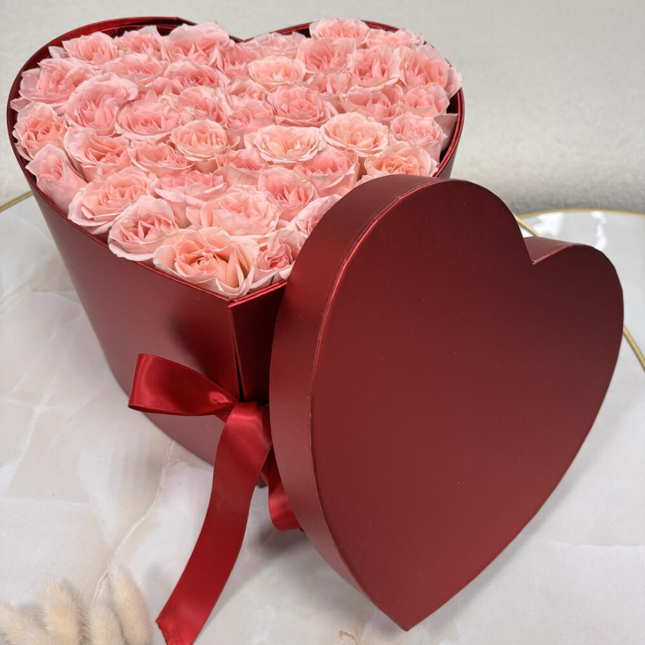 A bold red heart-shaped box filled with soft blush spray roses and fresh chocolate-covered strawberries. Inside you’ll find 19 strawberries total: 10 dipped in smooth milk chocolate and 9 in pink chocolate with delicate toppings. The roses are lush and perfectly arranged for a clean, elegant look. Visually stunning and irresistibly delicious.